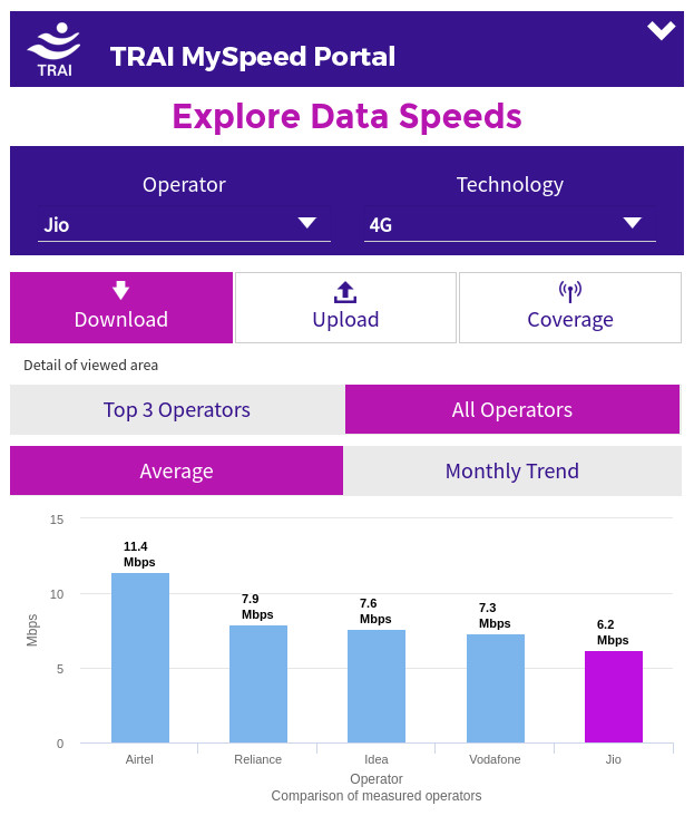 TRAI (Telecom Regulatory Authority of India) recently launched MySpeed app to measure and upload internet speeds. It also launched Analytics Portal to show users in detail about network coverage, data speed in their area and Quality of Service (QoS) of their telecom operators. The data on the portal shows that Reliance Jio’s 4G data speed is the slowest among top operators in the country.